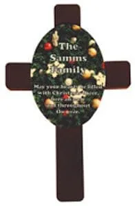 Item UNI5783  *  Cross Plaque, with HardBoard Oval Tile Insert (4.2″ x 5.9″), ¾” Mahogany Stained Wood Base (7″ x 11″), Keyholed With .25” Thick Oval Hardboard Tile and 2-Sided Tape for Mounting to the Cross Base.