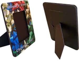 Item UNI5899 * Picture Frame, Unisub™ Gloss White Sublimation Hard Board, 7″ x 8.5″, with Easel, Black Beveled Edges. Sublimate a complimentary image on the frame (1″ wide top and bottom, 1.5″ sides), then insert a 4X6 photograph the old fashioned way